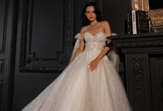 In the best fashion of the Sleeping Beauty princess, yes, we are sure that Aurora herself would have loved this dress definitely, powder gown Elizabett Deco is made for our most romantic and pretty brides. The way this dress is beautiful is indescribable, off-the-shoulder long sleeves, where lace and tulle are intertwined magically, gorgeous scattering of lace around the lush shiny skirt is truly holding that feeling of you being in a fairytale of your own love story. Cute elements as a satin waist belt is absolutely worth it to be one of the most romantic wedding dresses ever made.