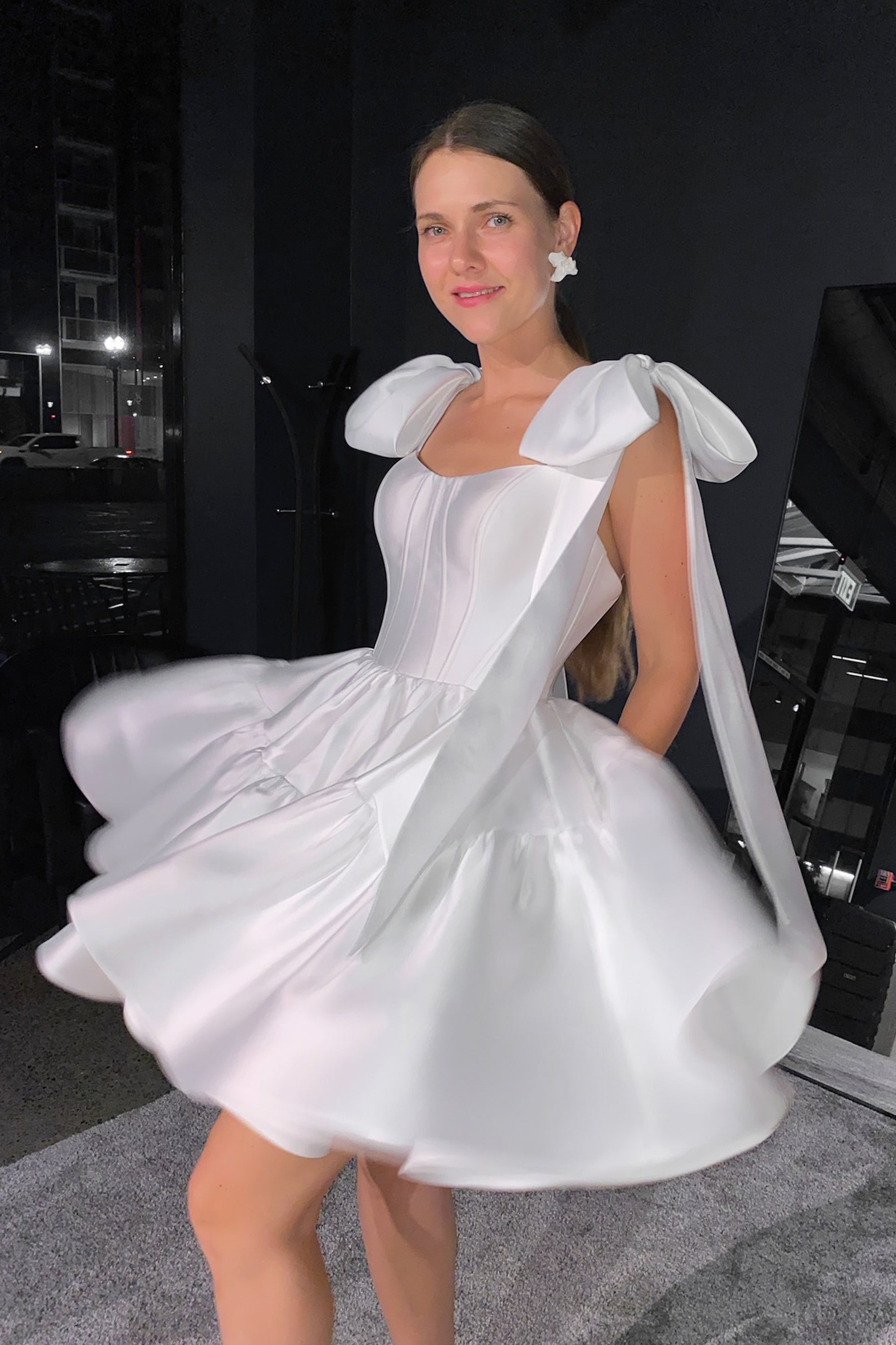 The ultimate wedding dress for a fun-filled celebration with a touch of elegance. This mini dress exudes carefree charm, reminiscent of a sunny day dance by the river. Featuring two thick straps adorned with bows, it offers both style and comfort. Crafted from high-quality Mikado fabric, the dress shines like a moonlight, ensuring you look like a dream come true on your special day.