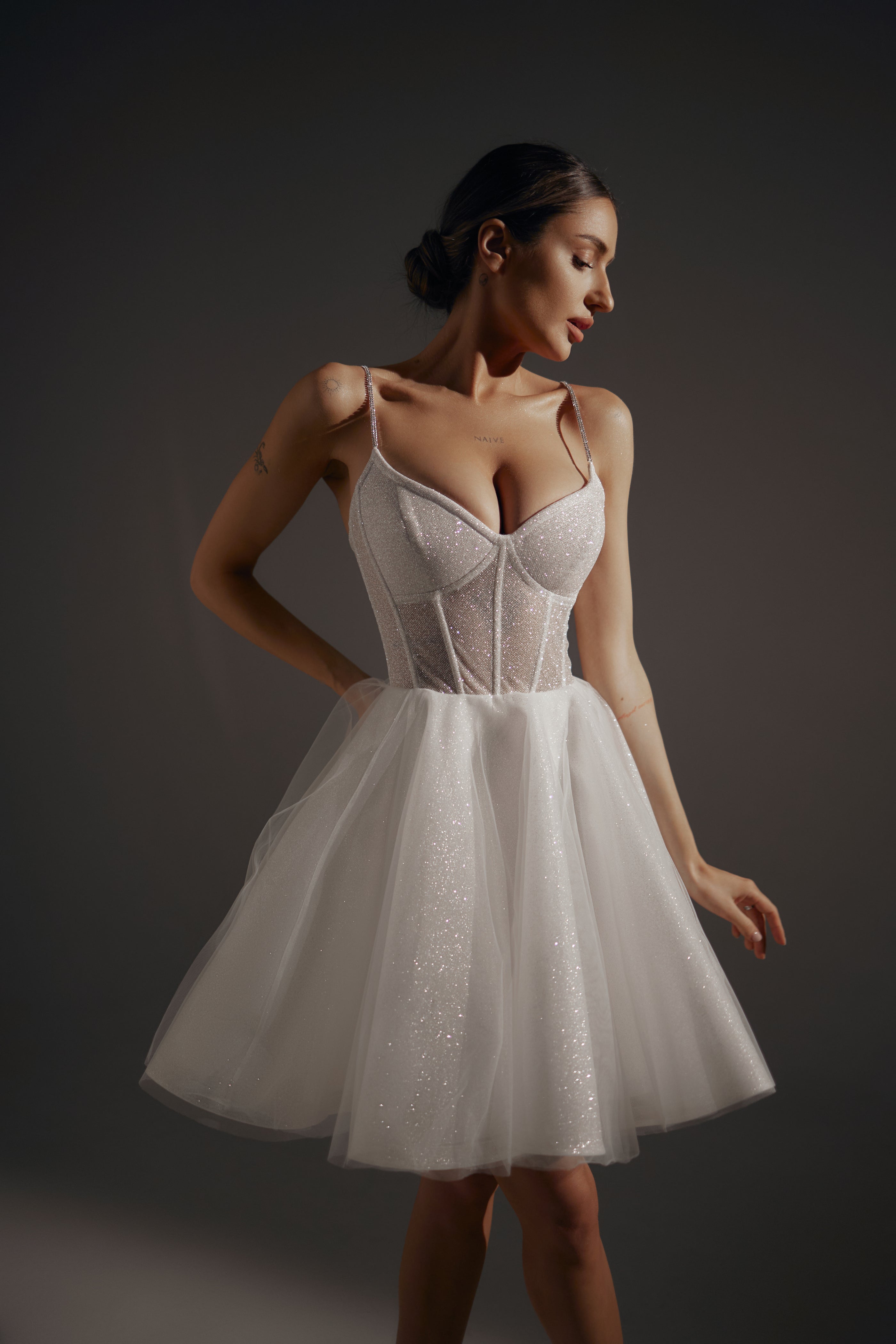 This glorious masterpiece of a gown is definitely the one to steal the spotlight. Short length and sparkles all over, thick straps that can be worn as an off-the-shoulder motif too, as well as a semi-sweetheart corset, absolutely pretty.