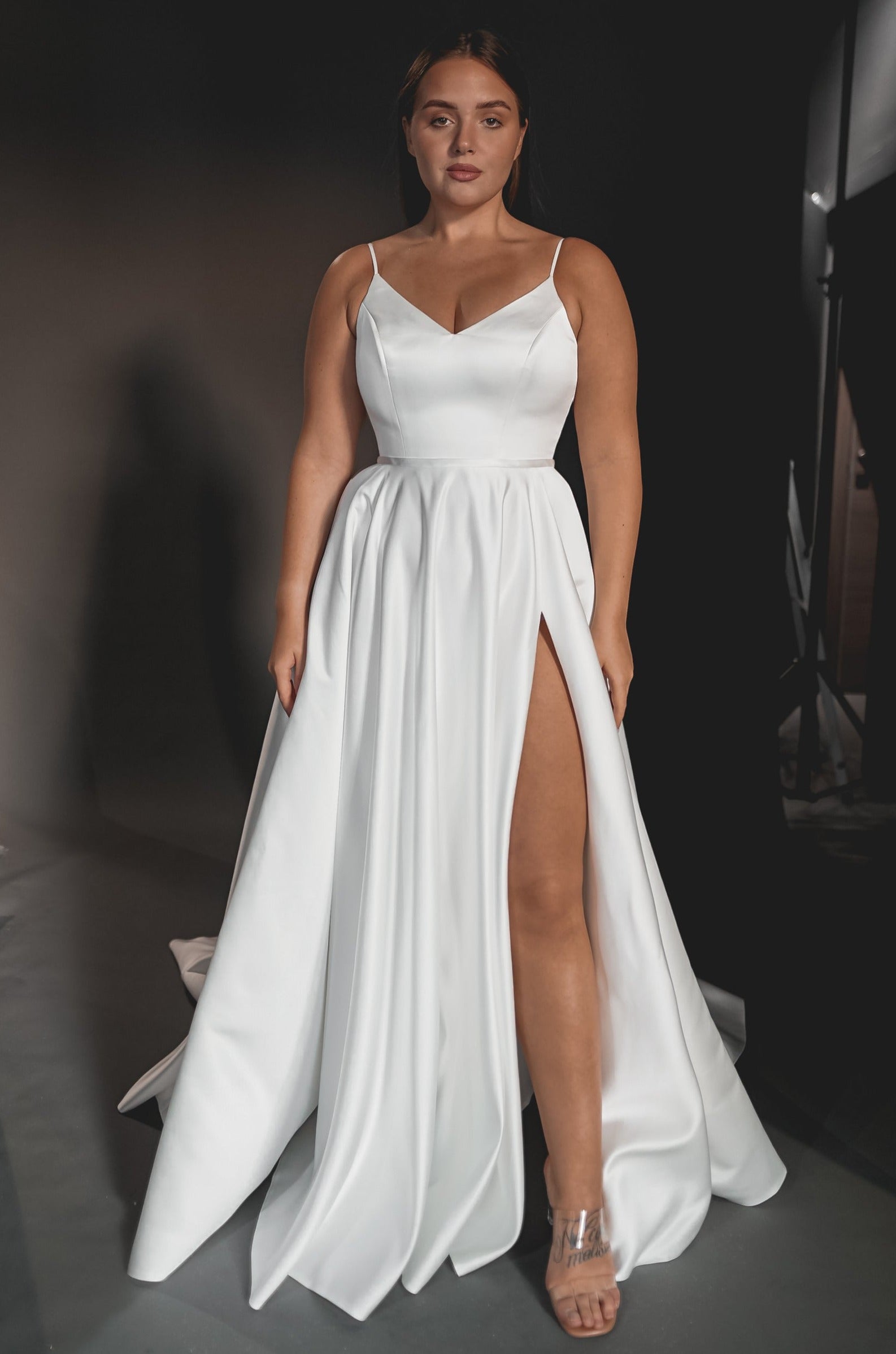 Congratulations! You've stumbled upon the perfect midi-length plus-size dress boasting an open back, blending minimalism with just the right amount of sparkle. The V-line and spaghetti straps add a touch of romance and style to your special day ensemble. And the best part? It is super affordable!
