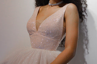 A stunning choice with a plunging neckline and illusion tulle. The V-cut back and corset strap add elegance, while the sparkly tulle skirt makes you shine like a diamond.