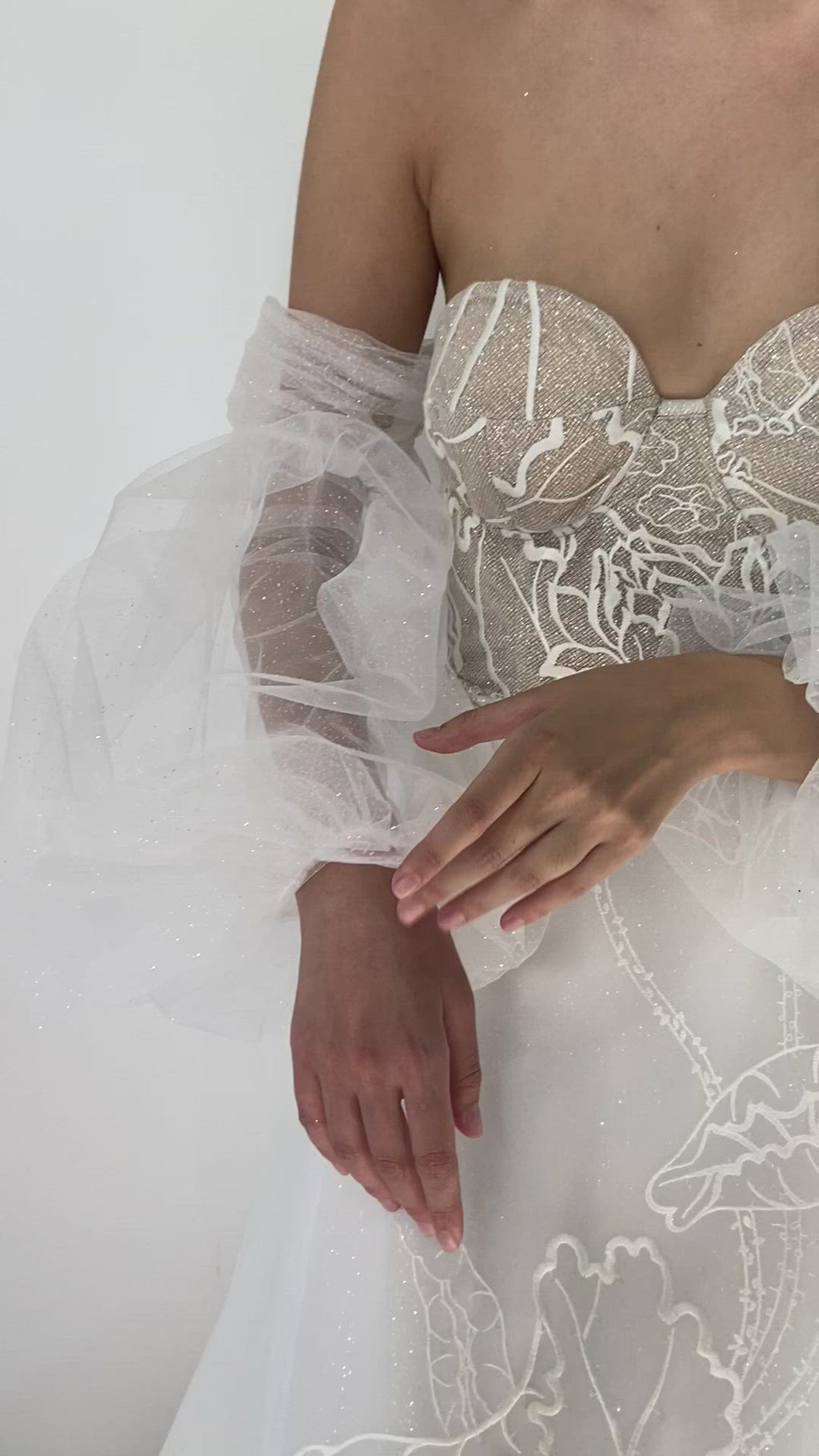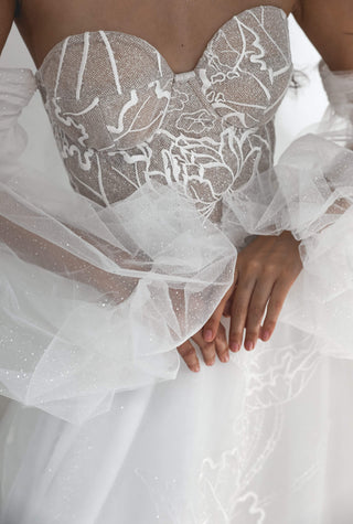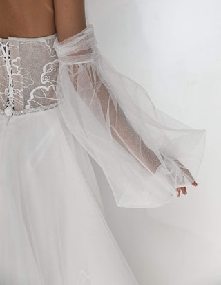 • The Romee puff sleeves add a light, airy touch to any dress, easily attachable and removable for versatile styling. Made of sparkly tulle, they bring a nymph-like charm to your special day.