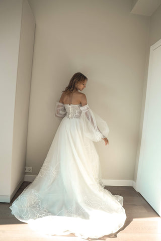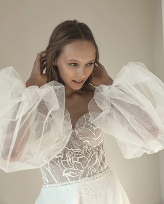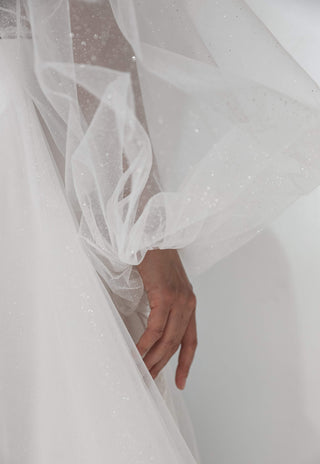 The Romee puff sleeves add a light, airy touch to any dress, easily attachable and removable for versatile styling. Made of sparkly tulle, they bring a nymph-like charm to your special day.