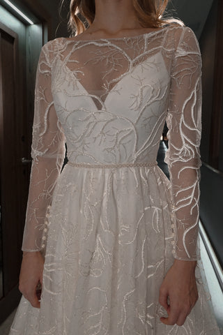 Get ready to steal the spotlight on your big day with our bedazzled wedding gowns. With sparkling embellishments that shimmer in the sunlight and reflect the warm hues of the sunset, these dresses are sure to turn heads. But the elegance doesn't stop there- our dresses also boast delicate lace, tulle details, beading, embroidery, and other stunning accents. Plus, we offer the option to personalize your gown by selecting the embellishments and top and bottom styles that suit you best.
