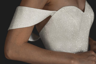 This dress is a kaleidoscope of love with its semi-sweetheart top, sparkly off-the-shoulder straps, and a dense corset that accentuates your waist. The airy, sparkly skirt adds playfulness and is perfect for dancing the night away!