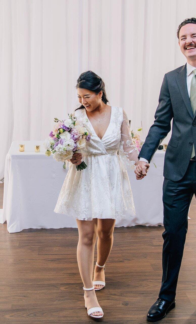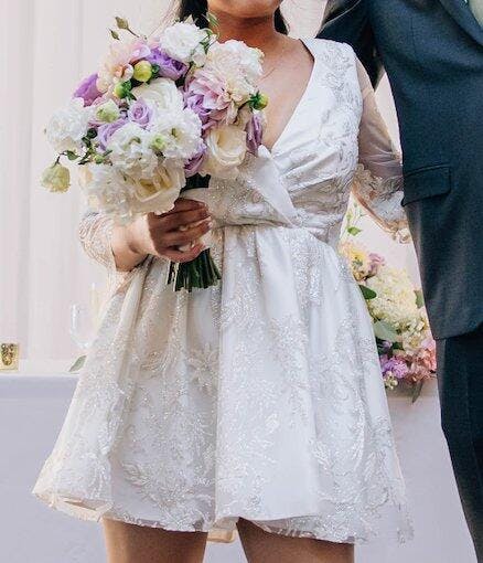 This dress was absolutely everything! I got married in Vegas and knew I wanted a short dress with sleeves and this was the first dress I found and fell in love. The sizing was a little complicated for me at first. Since my size according to their chart wasn’t returnable, it made ordering a little nerve racking. I didn’t want to order such an expensive dress and not be able to return it if I didn’t absolutely love it. I ended up reaching out to customer service and they were super helpful with helping me making a decision on what to do. I ended up ordering a smaller size that was returnable, to make sure I loved the dress before committing to my size, but by the time I got the dress it actually fit perfectly since I was on a weight loss journey anyway. It did take the max time they said it would take to deliver to me so make sure you give yourself plenty of time when ordering. But if you’re on the fence about this dress I suggest getting it!! I do highly suggest getting it customized to your size so it fits perfectly.