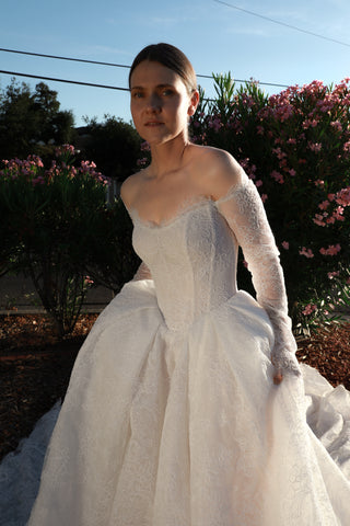 Embrace timeless elegance with the Lace Basque Waist Ball Gown Eilonwy. This sophisticated blush gown features long sleeves and an off-the-shoulder design that highlights a delicate semi sweetheart neckline, evoking classic princess charm. Crafted from exquisite Chantilly lace, it cinches at the basque waist to flatter your silhouette before flowing into a dramatic long train. The lace-up corset back ensures a perfect fit, creating a graceful and refined look for your most memorable occasions.