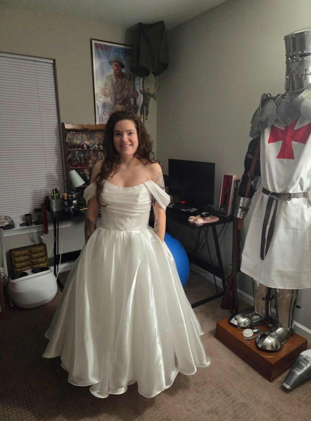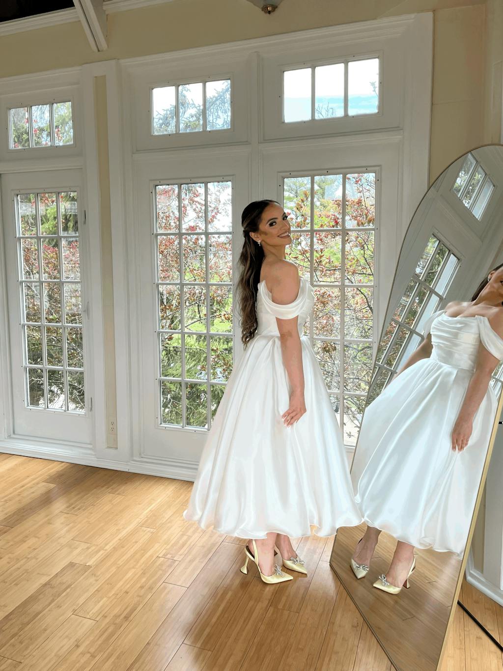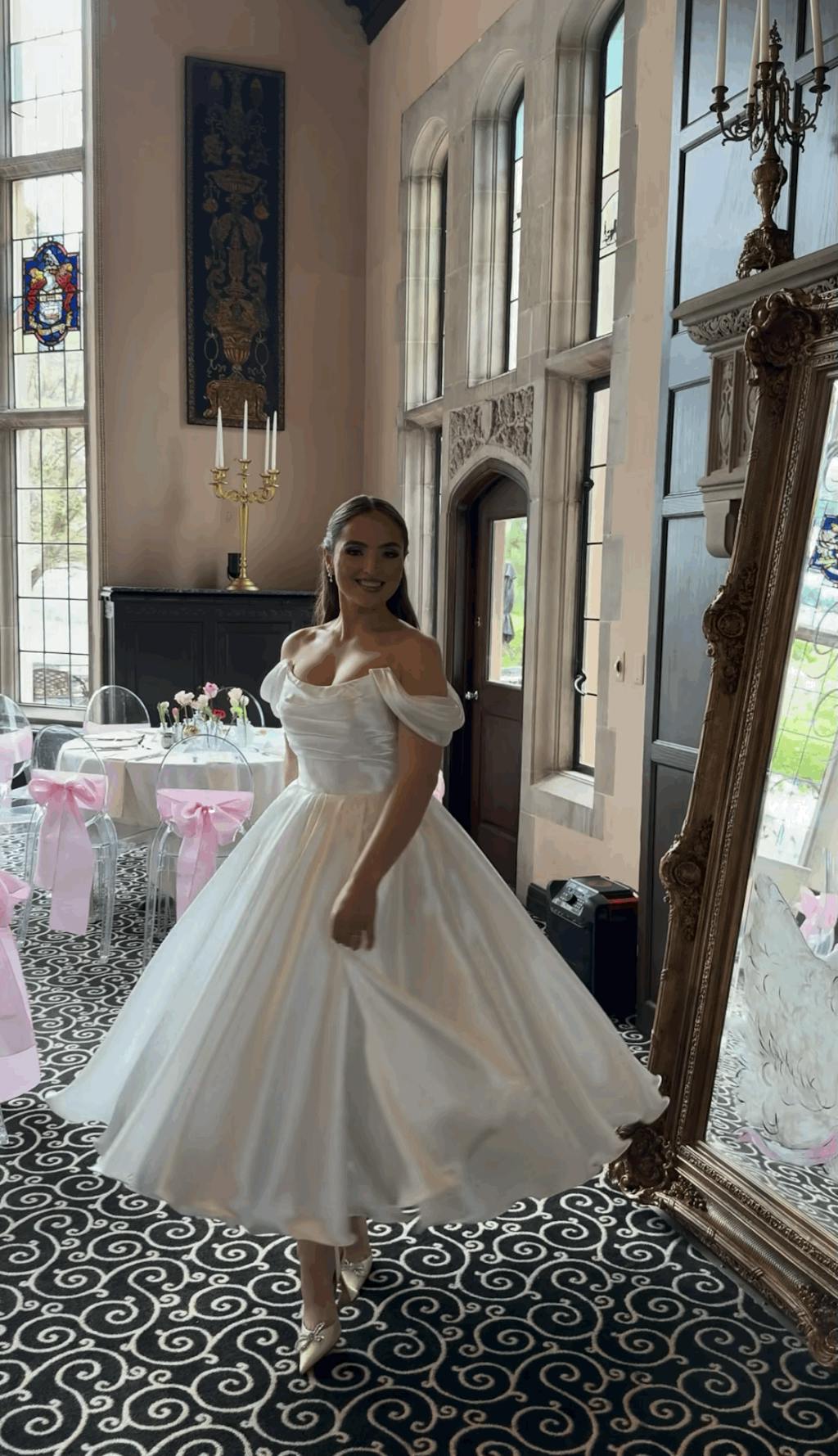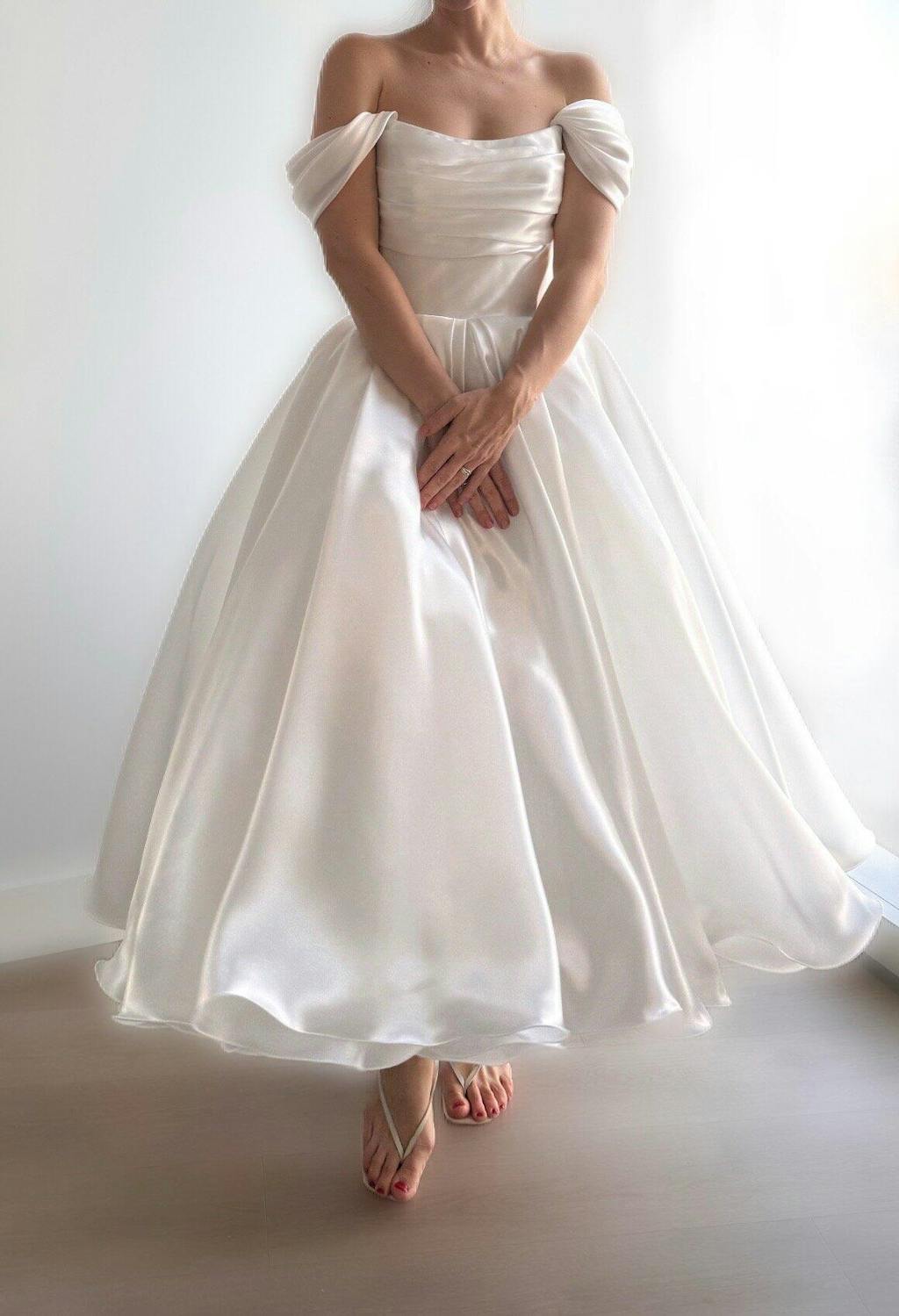 This gorgeous midi wedding dress features an off-the-shoulder design with a draped corset and thick straps, complemented by a lush skirt made from luxurious silky organza fabric. Perfect for a romantic yet sophisticated look.
