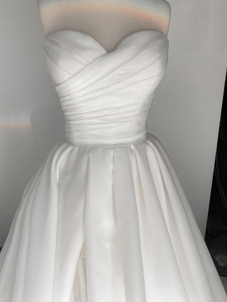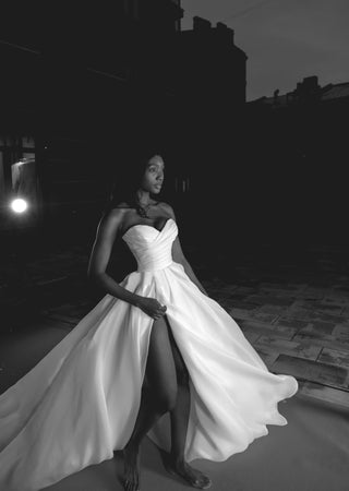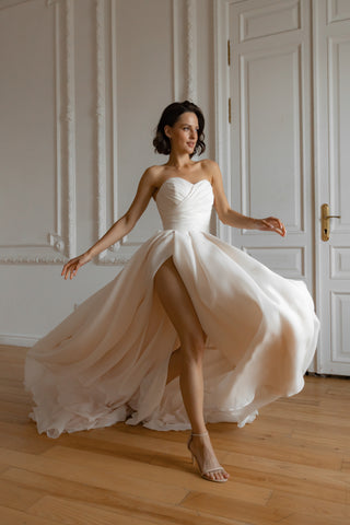 In this dress, you’ll look like a delicate flower. Made from floaty organza, it features a sweetheart corset with romantic creases highlighting your waist. The lush, airy skirt has a sexy front slit and a detachable train, making it versatile and enchanting.