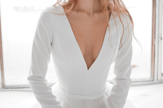 A minimalist plus size dress with a royal touch. The plunging neckline offers both elegance and security, while long sleeves complement the look. Fitted at the waist, the corset transitions into a flowing A-line skirt with a stunning train.