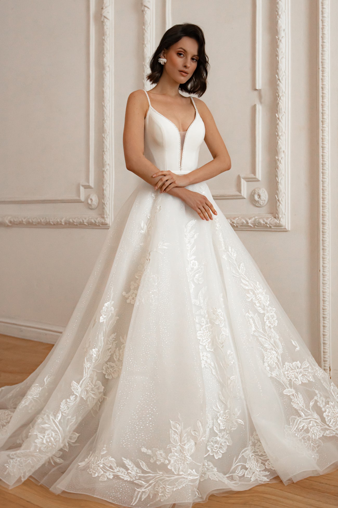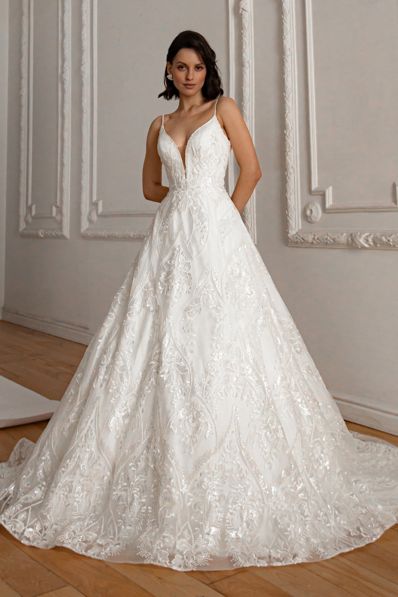 Dieses Kleid hat einen tiefen Ausschnitt – der größte Trend für Bräute 2024! Verziert mit Pailletten-Wandmalereien in einem unvergesslichen Design, umhüllt blumige Spitze das gesamte Kleid und natürlich jede Menge Glitzer.