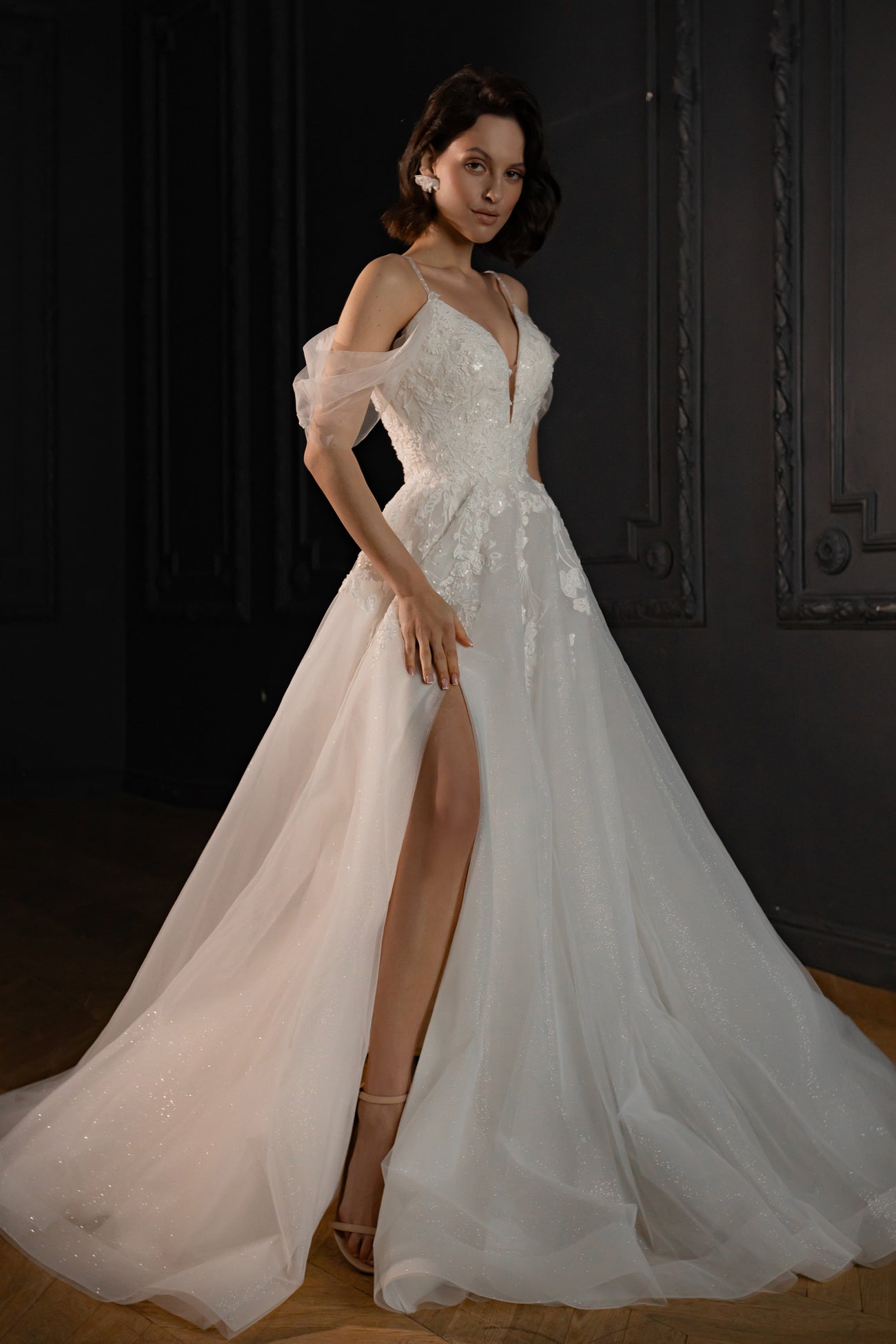 Natürlich ist keine Brautkollektion ohne einen sexy Beinschlitz komplett. Dieses Kleid verkörpert wahre weibliche Energie und ist mit schimmernden Blüten verziert – perfekt für einen Frühlings-Sommer-Look.