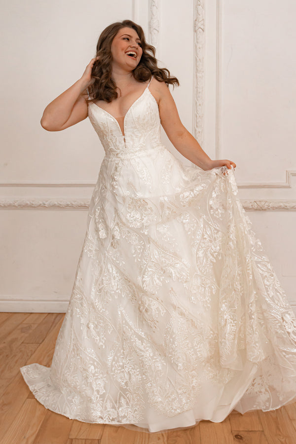 Das Chyanne-Kleid ist ein perfektes Beispiel für ein Tüllkleid, aber die aufwendigen Blumendetails der Spitze können die Reinigung erschweren. Sie können versuchen, Tüllteile selbst zu reinigen, aber seien Sie vorsichtig bei voluminöser Blumenspitze. Weitere Tüllkleider finden Sie hier.