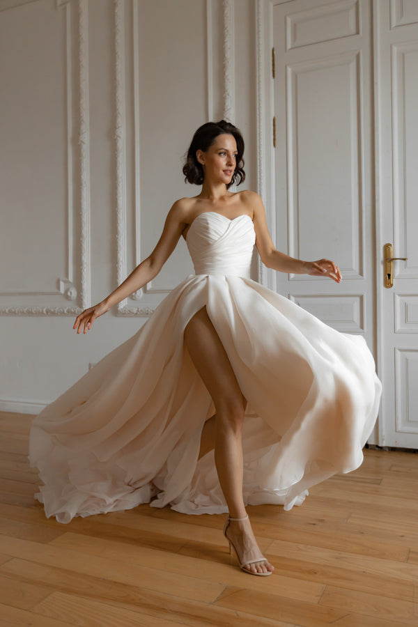 Diese ärmellose Variante des Audrey-Kleides ist nur eine der vielen Möglichkeiten, es zu tragen. Sie können sich für ein vollwertiges Modell entscheiden, das Ihnen mehr als neun Looks gleichzeitig bietet, oder auch nicht. Der weiche, aber hübsche Organza-Stoff und alle abnehmbaren Elemente müssen sorgfältig aufbewahrt werden. Weitere Organza-Brautkleider finden Sie hier.