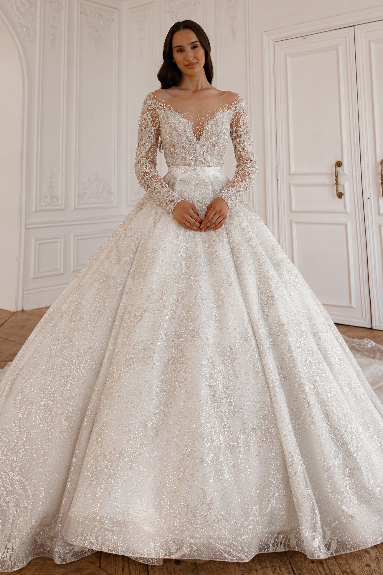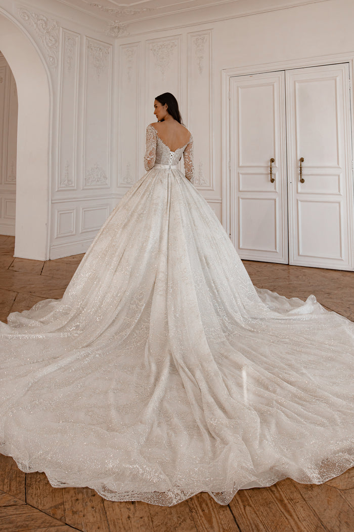 Dieses bestickte Sabrina-Kleid besticht durch einen tiefen Ausschnitt, der mit einem Bateau-Illusionstüll verziert ist, der mit Hunderten von glänzenden Perlen besetzt ist. Die langen Ärmel und der strahlende Rock verleihen Ihrem Look ein neues, schimmerndes Extravaganz-Niveau. Übrigens: Die Schleppe dieses abnehmbaren Rocks ist atemberaubend.