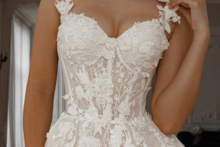 - Die Breite des Schnürbereichs auf der Rückseite des Brautkleides kann je nach Maß und Stärke der Schnürung zwischen 2,5 und 15 cm variieren.
