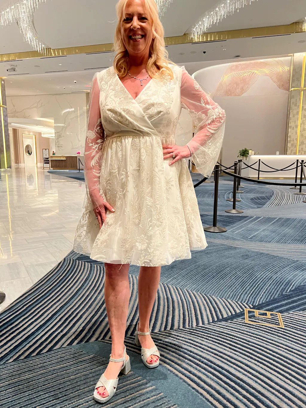 I had a great experience with this dress. It was perfect for a Spring Vegas Wedding. I ordered a size 20 and then lost a little weight therefore I had it altered. The shoulders were taken up an inch and she tacked the bust line as I did not want as much cleavage showing. The lace on the sleeves was a bit itchy so Anastasia has some tulle sent to me so I could have it sew into the arms by my seamstress. I ended up not doing that but I felt the effort to resolve the issue was sufficient. I got used to the sleeve and felt comfortable in the dress for the duration of the wedding and the after festivities.