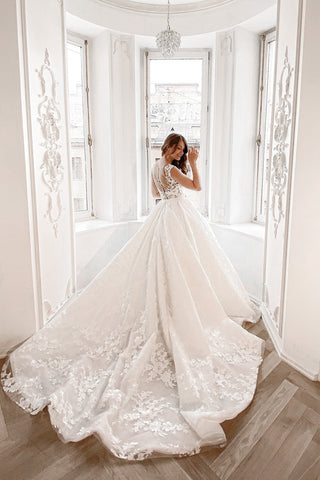 This detachable Airis skirt transforms any dress into a royal princess look. With layers of puffy tulle, shimmering lace, and a subtle train, you'll feel uniquely radiant.