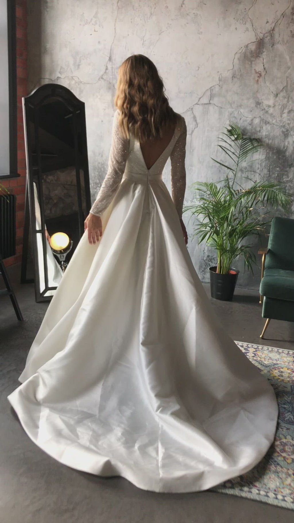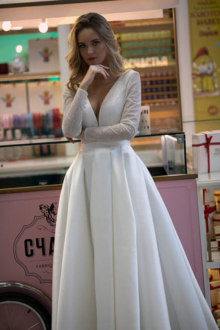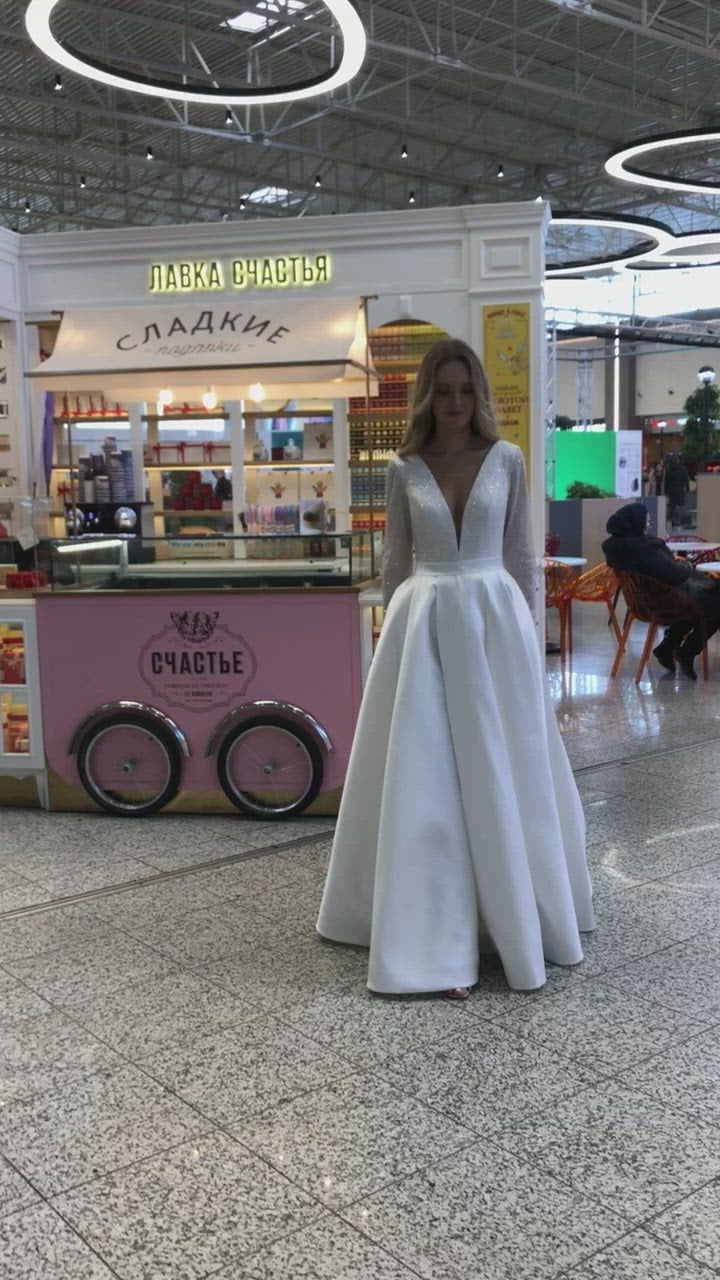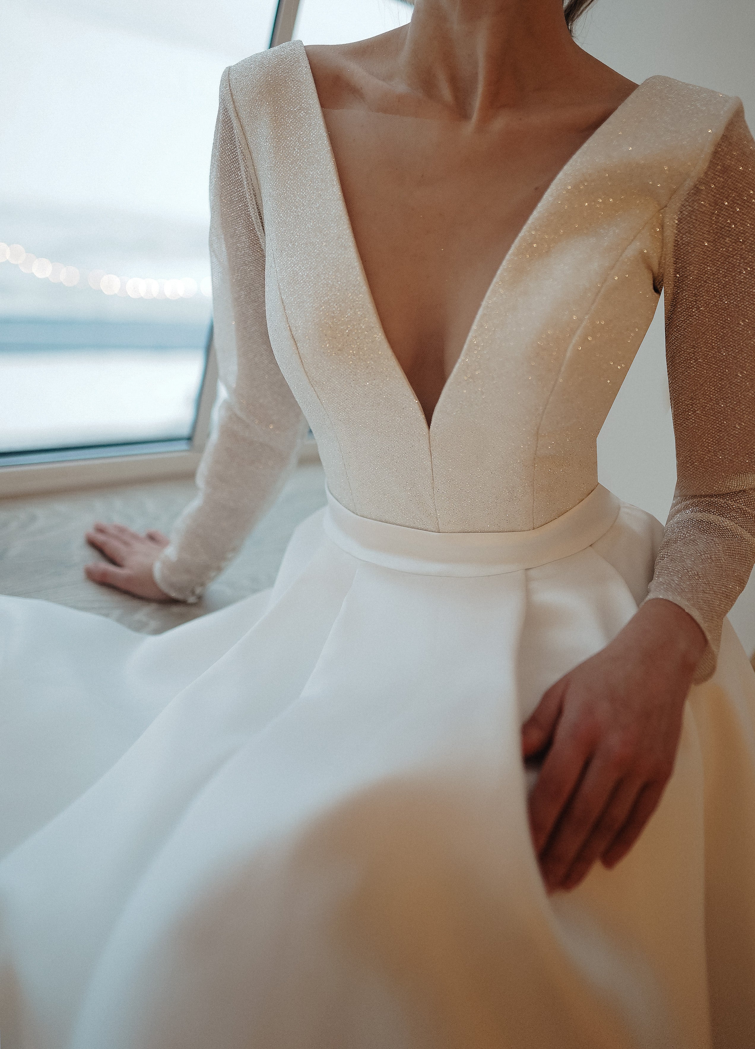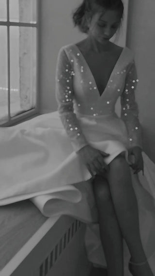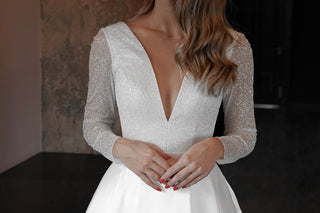 Mikado skirt AND shimmering top with a very deep décolleté, no, it’s not too much trust us ;) In fact, it’s just perfect. Upper part is an open back and prolonged V-line, covered in a scattering of sparkly sequins, slightly see-through sleeves form a very stylish bodice. To tip the scale into a classy style a bit, sparkly top connects to a gorgeous Mikado skirt, made out of flossy satin and flutters into a princess gown like train. If the sleeping beauty got married in our century, this would be absolutely her dress of choice. Be fierce, be romantic and be you in our A-line Koussindy dress.
