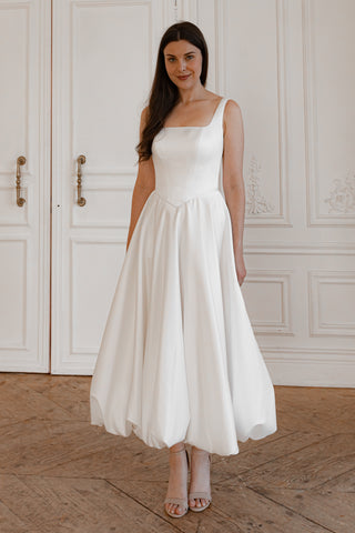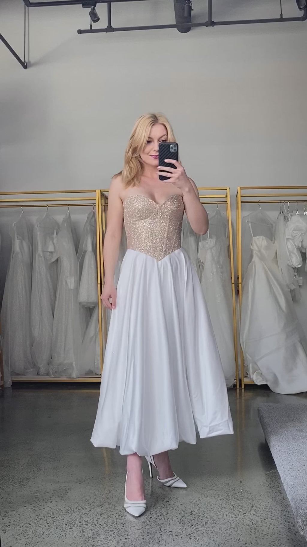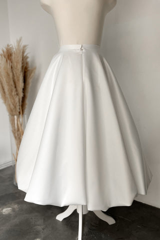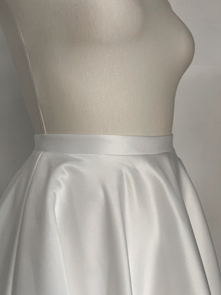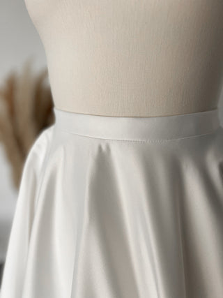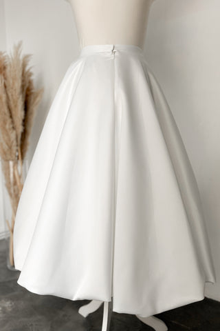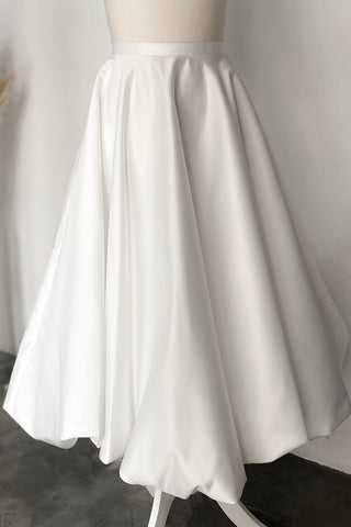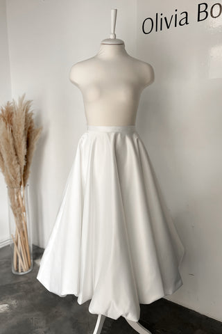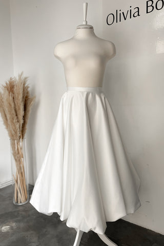 This midi-length detachable satin skirt adds a Hollywood vibe to any corset, elevating your wedding attire with effortless style. Easy to wear and detach, it’s a chic addition to any gown.