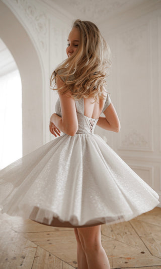 Our stunning mini dress features a sweetheart corset with thick straps, an open back, and a puffy tulle skirt for a playful silhouette, perfect for dancing the night away.