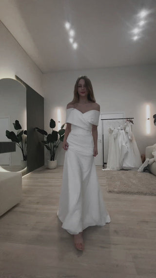 This off-the-shoulder sheath dress features a sparkling crossed top, open back, and a full-length, skin-tight skirt with a subtle train.