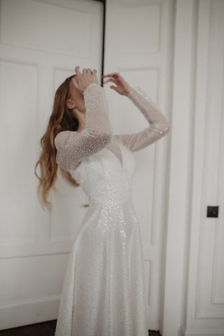 Feilin is a royal A-line wedding dress with spaghetti straps, an open back with pearly buttons, and a satin-like gown. Its beaded tulle top layer and long sleeves create a shimmering waterfall effect.