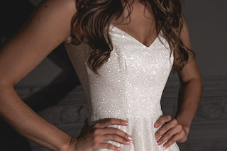 - Fabric with dense glitter may crumble slightly at the first fitting. Shake the dress over a bathtub or other accessible surface to shake off excess glitter that has not gotten on the glue.